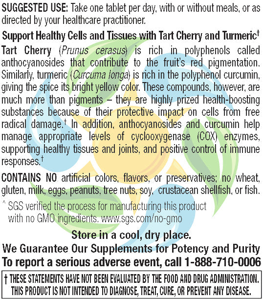 Health-boosting qualities of Tart Cherry and Turmeric Curcumin combine to form a superior antioxidant and anti-inflammatory supplement. The antioxidant and anti-inflammatory properties of Tart Cherry and Turmeric Curcumin promote tissue and cellular health by protecting cells from free radical damage.