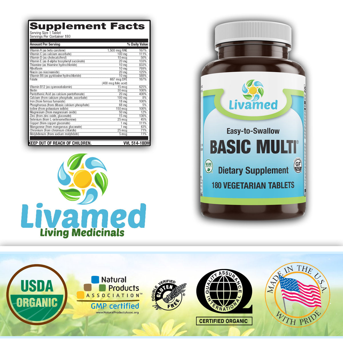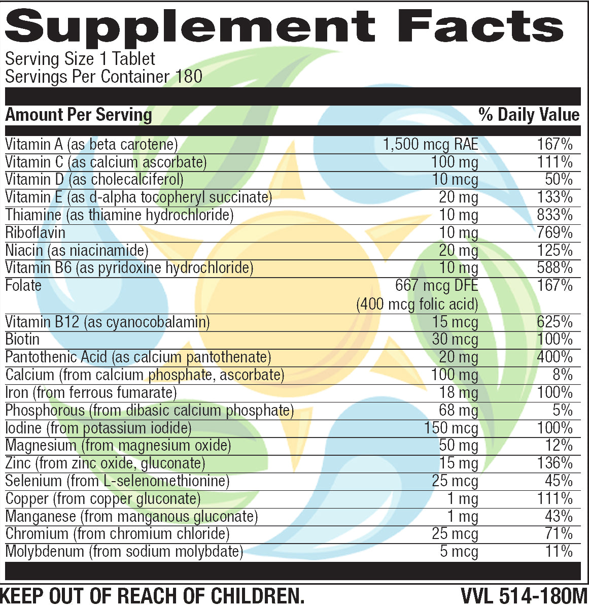 Multivitamins are designed to fill nutritional gaps in the diet, offering all essential vitamins and many minerals. The Basic Multi® is a low-potency multi that may be beneficial for people who simply want basic nutritional support in a one-per-day, easy-to-swallow vegetarian tablet. This product is a good alternative to over-the-counter multies that may contain a long list of excipients, fillers and artificial colors. It offers all eight B-complex vitamins, 100% of the Daily Value of Vitamin A as beta-carotene as well as 100% of Vitamin D3 (cholocalciferol), iron and 100% of folic acid, very important for women of childbearing years, plus antioxidant vitamins and minerals.