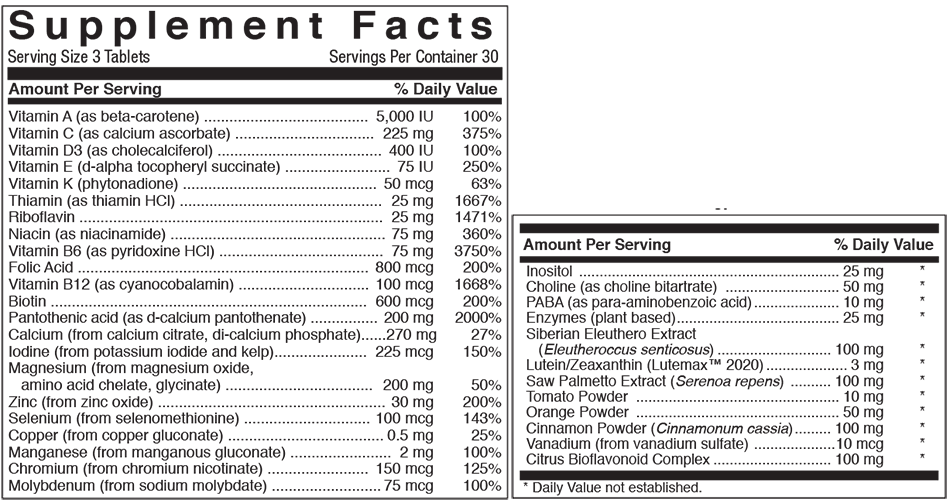 Though many multivitamins and minerals in our line provide high doses of essential nutrients, only Livamed Men's Multi specifically addresses the unique nutritional needs of today's man. In addition to providing 100% of 19 vitamins and minerals, Men's Multi contains Siberian Eleuthero extract and marigold extract, both powerful antioxidants. It also includes saw palmetto and lycopene for prostate health. This iron-free multi is specially formulated to reflect the demands of modern men, providing them with a divided dosage for nutritional support throughout the day.
