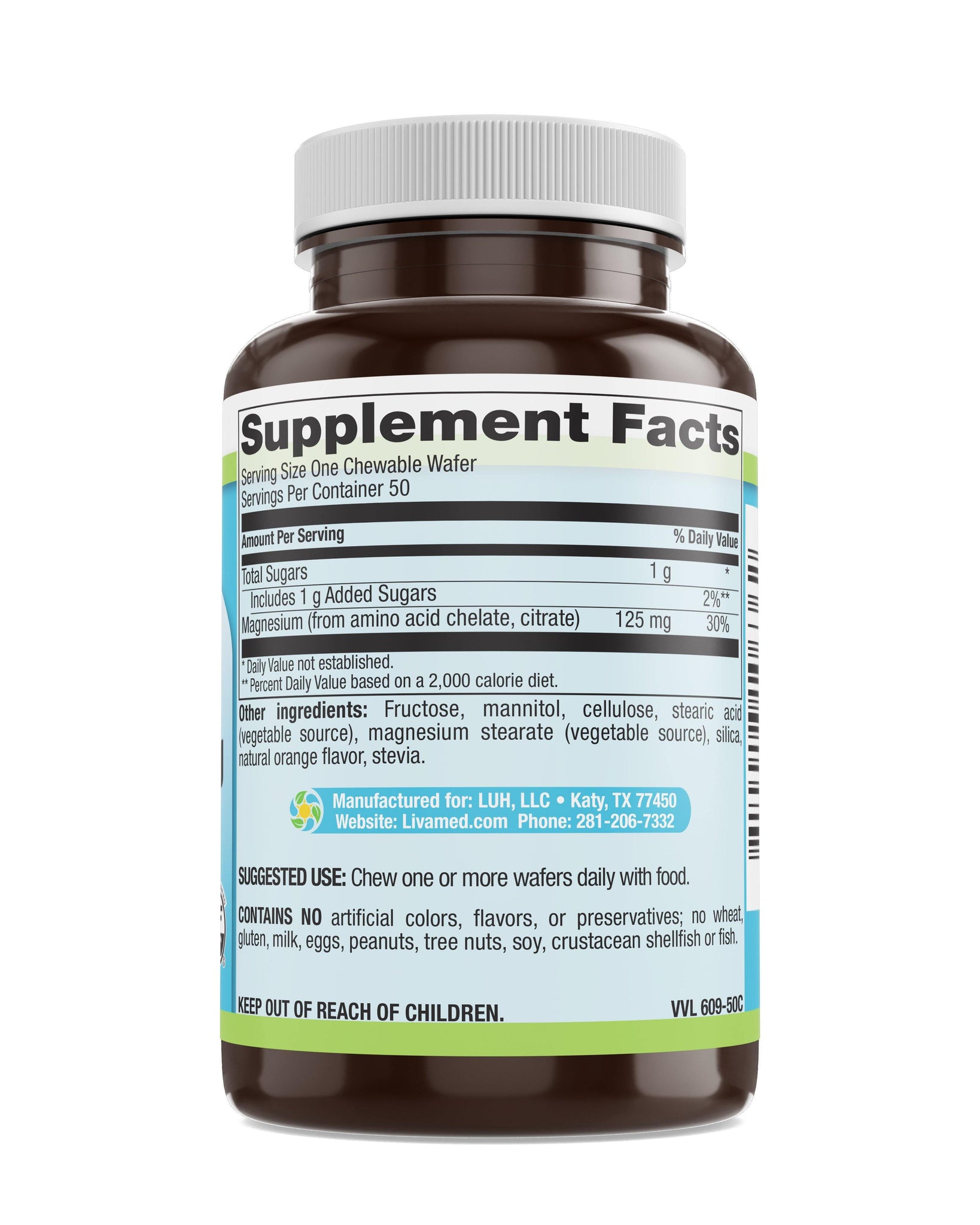 - Each chewable wafer contains 125 mg of magnesium (31% of the Daily Value).