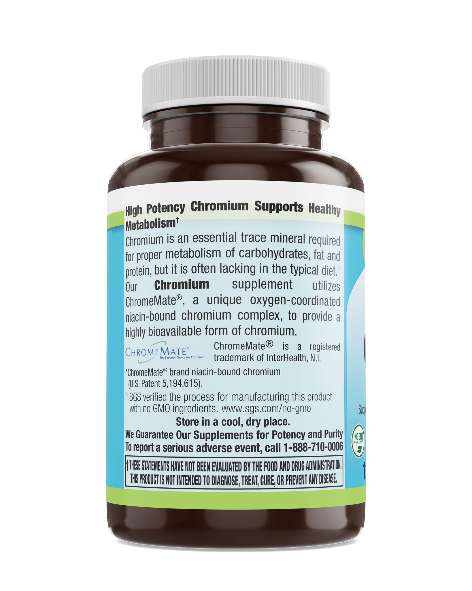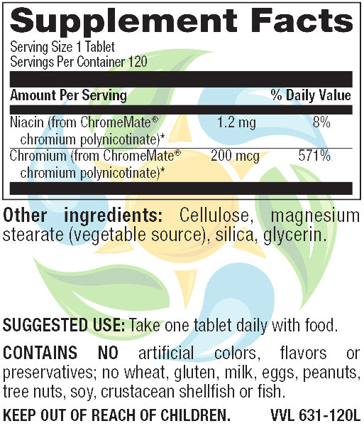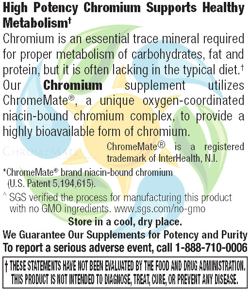 Chromium is an essential mineral important for regulating sugar metabolism. Because the average American diet lacks adequate chromium, and because of a high prevalence of metabolic issues existing in this country, chromium is needed more than ever to assist. In addition, large intakes of refined carbohydrates actually depletes chromium stores in the body. Chromium works closely with insulin to help cells utilize glucose (blood sugar). Those with blood sugar issues should consult their health care practitioner before using this product.