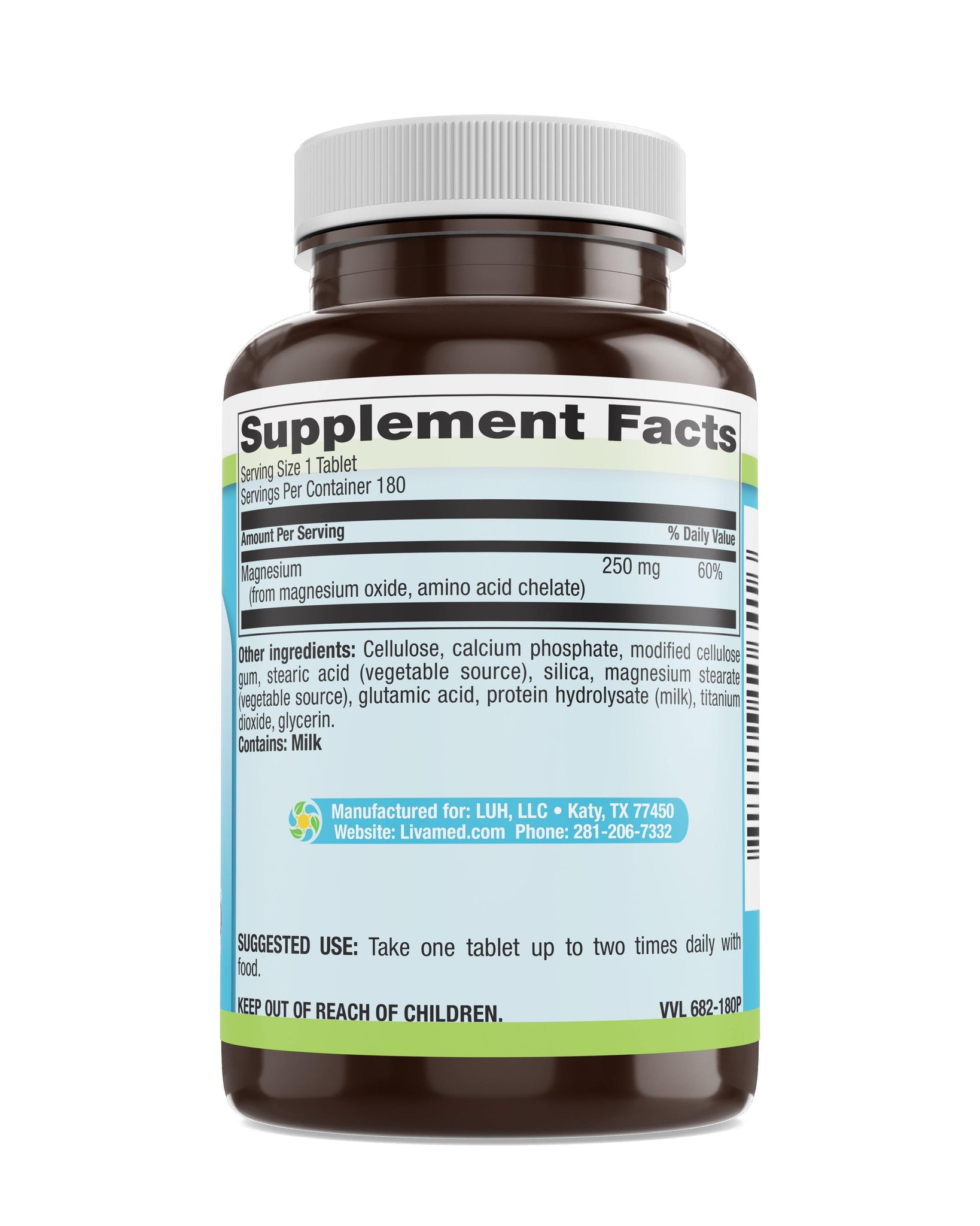 Chelated Magnesium from Magnesium Oxide, the most concentrated form of magnesium, and Amino Acid Chelate. You can take much higher dosages of chelated minerals without having to worry about competitively inhibiting other minerals from being absorbed