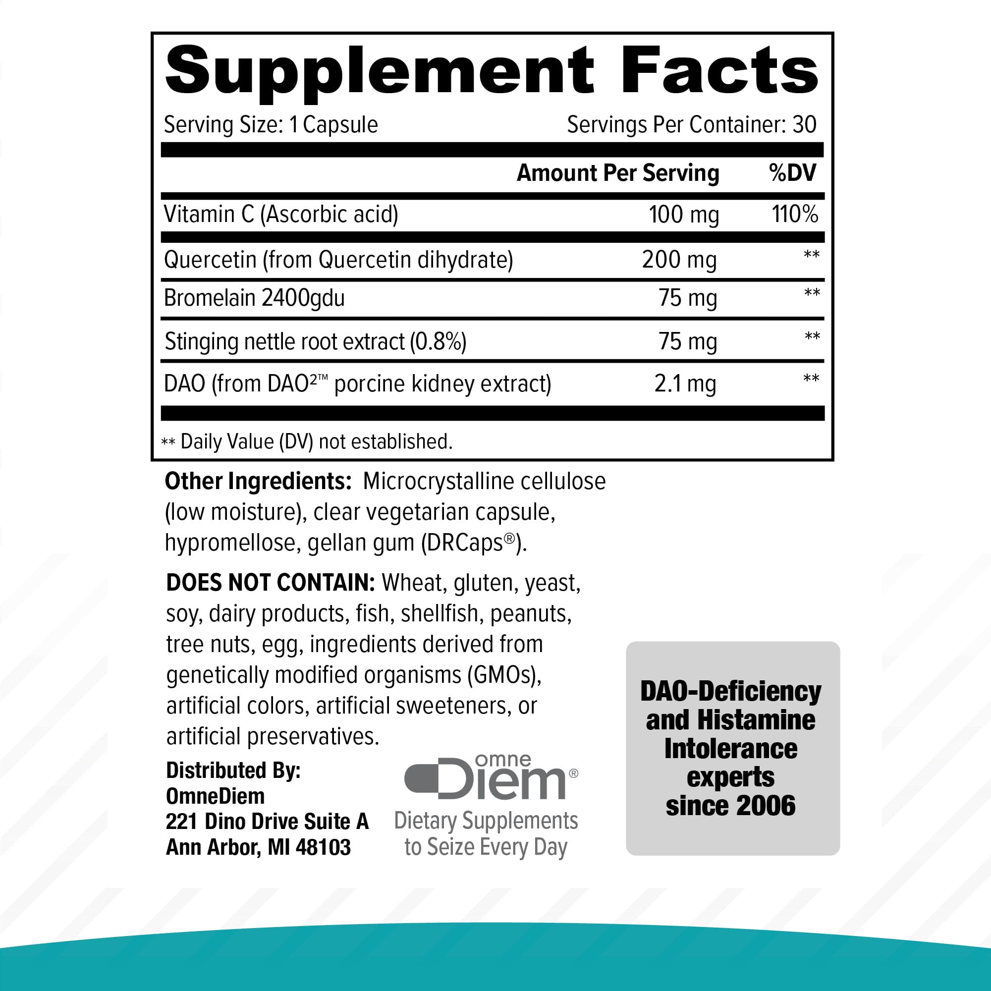 - For Overall Season Histamine Response & Gut Health: Our histamine intolerance formula keeps your gut soothed, immune system strong, and head clear. It helps your body reduce histamine response. With our DAO supplement, you can enjoy histamine-rich foods like wine and cheese without worry. Our natural DAO Enzyme Supplement boosts Diamine Oxidase levels to help your body break down histamines. Combined with Bromelain, Quercetin, Vitamin C, and Stinging Nettle Leaf to minimize your body's response to environmental histamine.