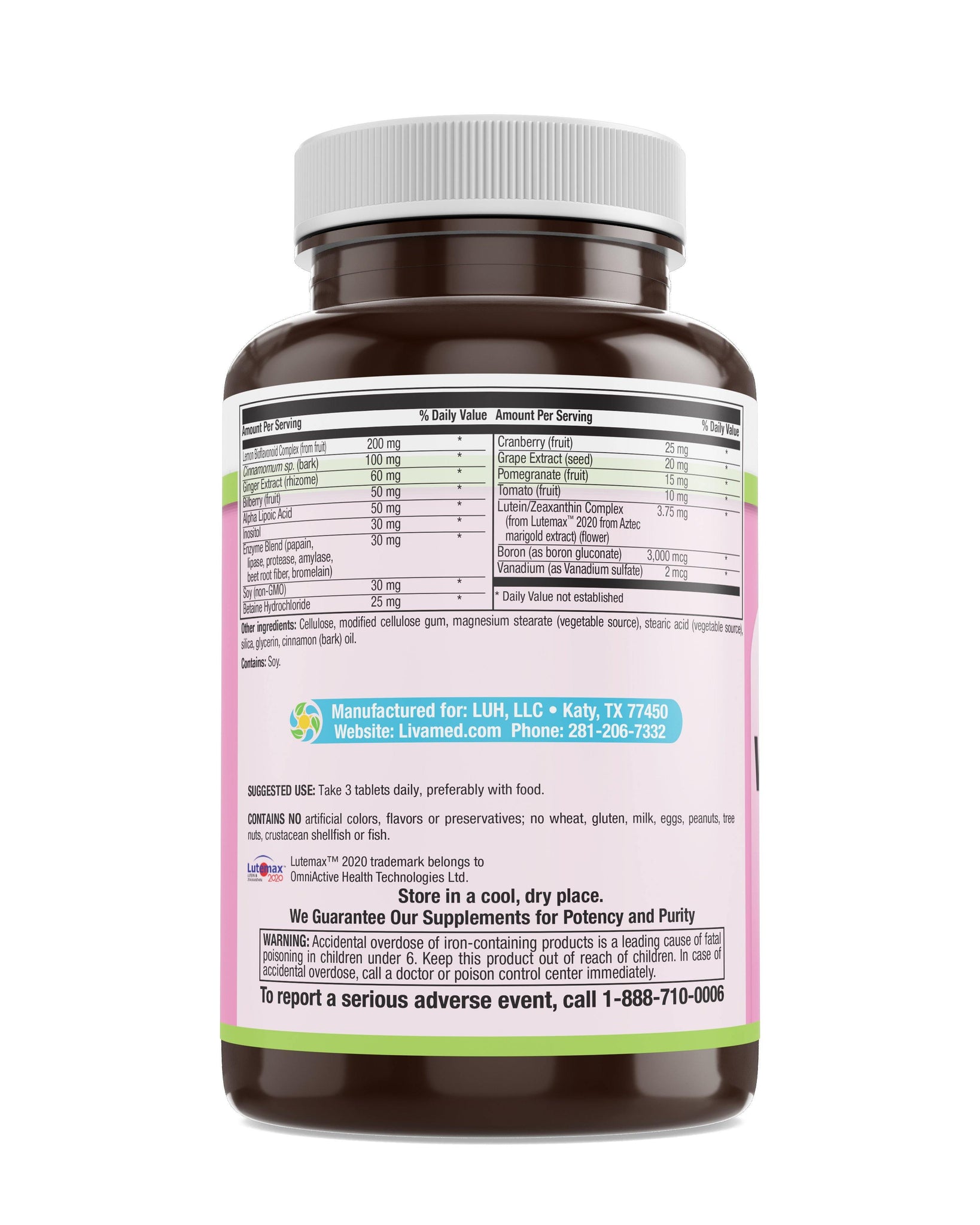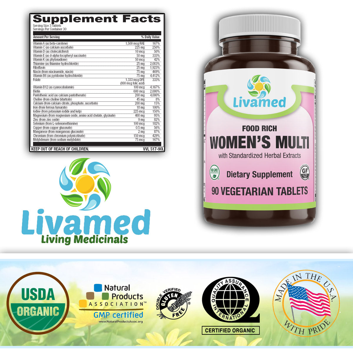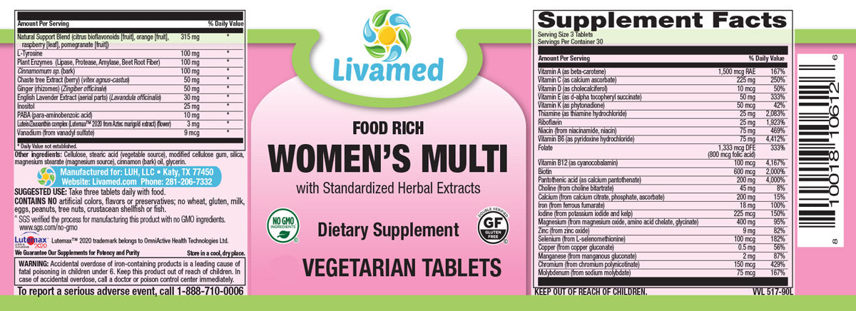 Livamed’s Food Rich Women's Multi also includes botanical support from six beneficial herbs: bilberry, ginger, cranberry, pomegranate, grape extract and cinnamon. Plant-based enzymes and bioflavonoids round out this 100% vegetarian formula.